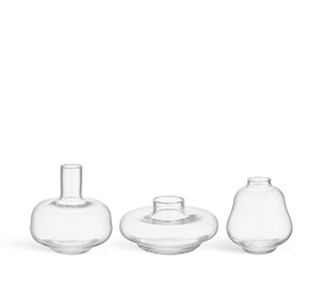 3点セット こちらは、クリアガラスのミニベース3種類をセットにした商品です。ころんと丸みを帯びたそれぞれ異なるフォルムが並ぶことで、やわらかく愛らしい表情を楽しめます。