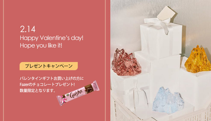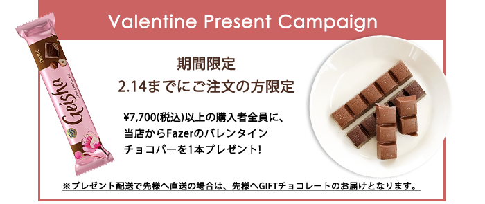 また、毎年ご好評頂いておりますバレンタイン企画として税込7,700円(税込)以上お買い上げの方に、フィンランドの老舗チョコレートブランドFazer(ファッツェル)のチョコレートバーをプレゼントいたします!