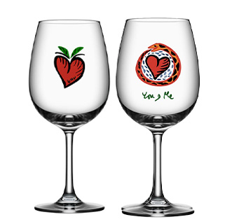 ウルリカ・ヒードマン・ヴァリーンによるユニークな絵とメッセージがプリントされたワイングラス。