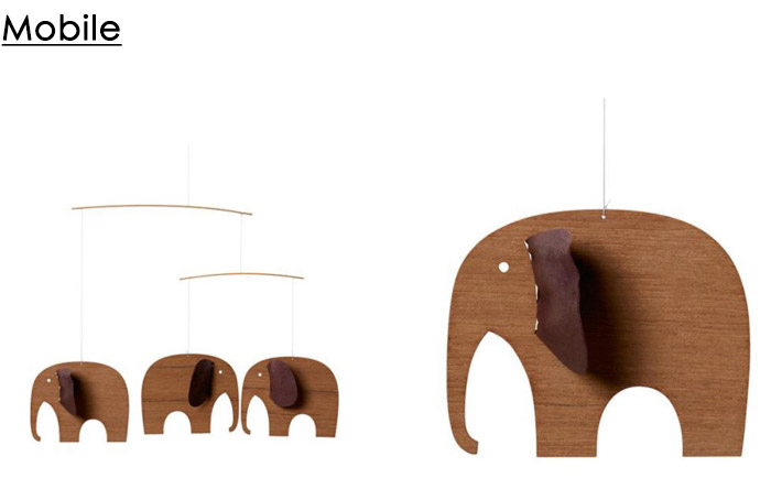モビールは空間のかすかな空気の流れを捉え、正確なバランスポイントで吊るされたパーツが生命を得たようにゆらゆらと揺れ動く様は、「動く彫刻」とも呼ばれています。 ■フレンステッドモビール 木製エレファント3
