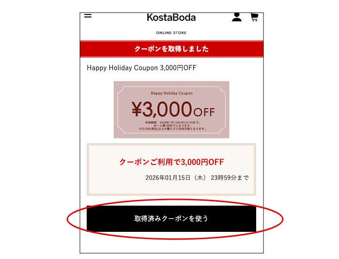 クーポン取得画面が表示されてから、「取得済みクーポンを使う」をクリックしてお買い物をお楽しみください。