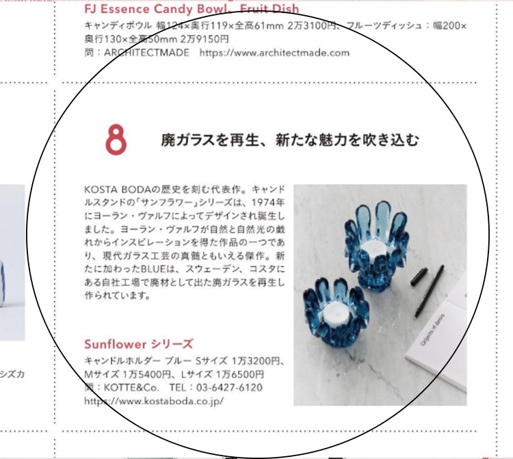 2023年3月7日発売 「今話題のサステナブルデザイン」特集「色も形も綺麗なリサイクルガラス」に |